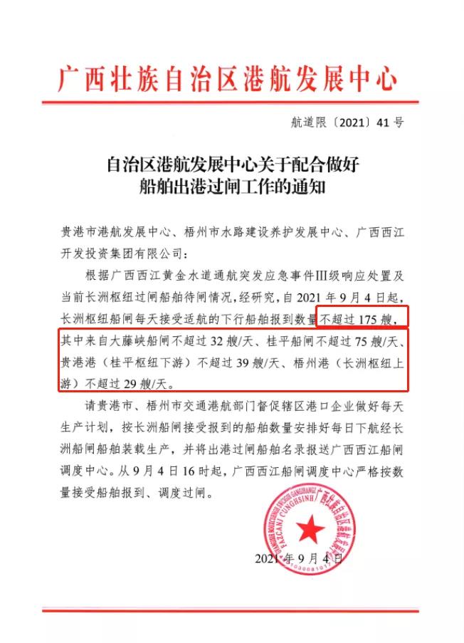 9月4日廣西壯族自治區港航發展中心發《自治區港航發展中心關于配合做好船舶出港過閘工作的通知》(航道限〔2021)41號)給貴港市港航發展中心、梧州市水路建設養護發展中心、廣西西江開發投資集團有限公司稱,根據廣西西江黃金水道通航突發應急事件IⅢI級響應處置及當前長洲樞紐過閘船舶待閘情況,經研究,自2021年9月4日起,長洲樞紐船閘每天接受適航的下行船舶報到數量不超過175艘,其中來自大藤峽船閘不超過32艘/天、桂平船閘不超過75艘/天、貴港港(桂平樞紐下游)不超過39艘/天、梧州港(長洲樞紐上游)不超過29艘/天。