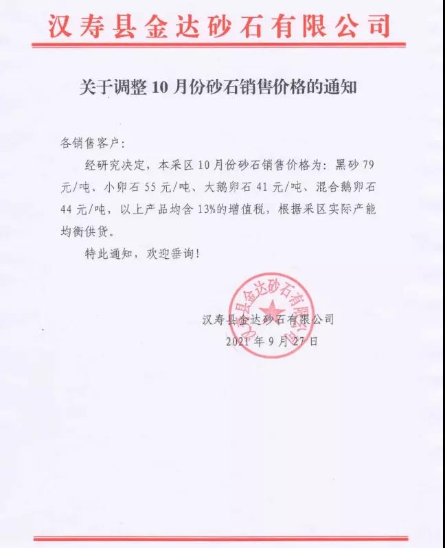 9月27日,湖南省漢壽縣金達砂石有限公司發布《關于調整10月份砂石銷售價格的通知》。通知顯示該采區10月份砂石銷售價格為:黑砂79元/噸、小卵石55元/噸,大鵝卵石41元/噸、混合鵝卵石44元/噸,以上產品均含13%的增值稅,根據采區實際產能均衡供貨。