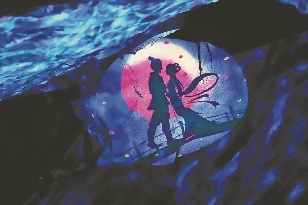一路走來,洞內景觀運用4K動態3D影片制作技術。財神爺面容和善,招財進寶合家歡。月老座下紅繩纏繞,千里姻緣一線牽。桃花林中萬株桃樹,一眼望不到頭。移步換景,滿眼花海,讓游客體驗《三生三世十里桃花》里的場景。