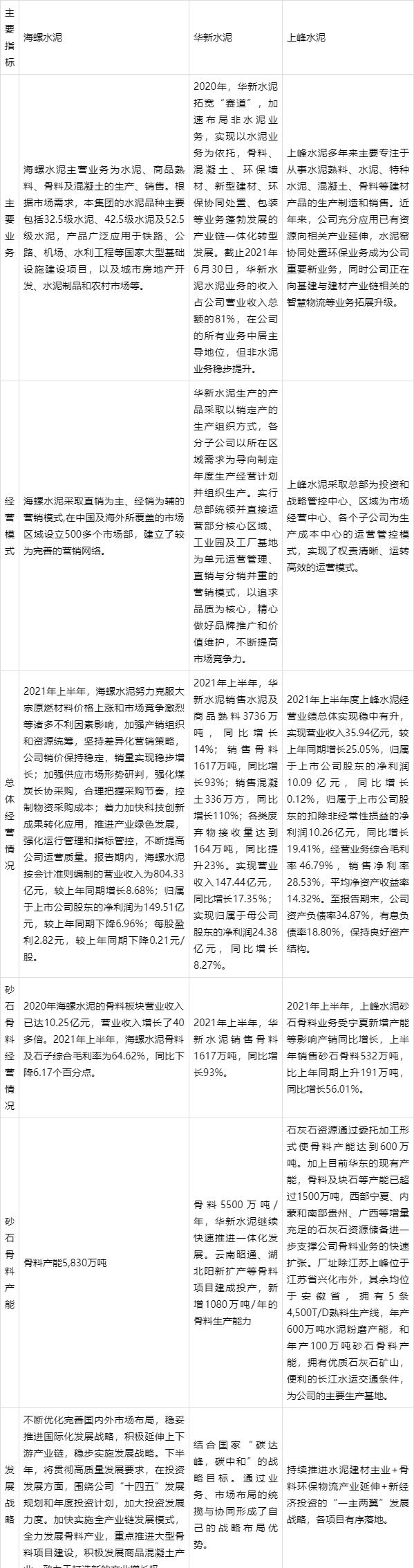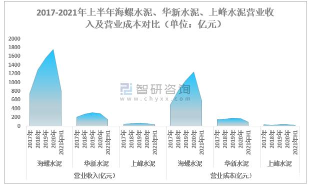 2020年海螺水泥營業收入1762.43億元,華新水泥營業收入293.57億元,上峰水泥營業收入64.32億元;海螺水泥營業成本1248.48億元,華新水泥營業成本174.40億元,上峰水泥營業成本33.06億元。2021年上半年海螺水泥營業收入804.33億元,華新水泥營業收入147.44億元,上峰水泥營業收入35.94億元;海螺水泥營業成本580.75億元,華新水泥營業成本93.08億元,上峰水泥營業成本19.13億元。