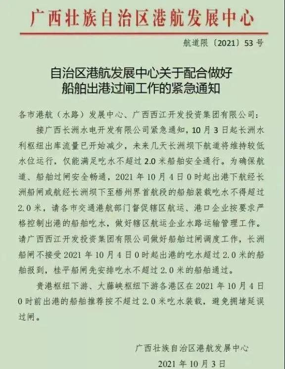 《通知》還強調,各市交通港航部門督促轄區航運、港口企業按要求嚴格控制出港的船舶吃水,做好轄區航運企業水路運輸管理工作。請廣西西江開發投資集團有限公司做好船舶過閘調度工作,長洲船閘不接受2021年10月4日0時期出港的吃水超過2.0米的船舶報到,桂平船閘先安排吃水不超過2.0米的船舶通過。