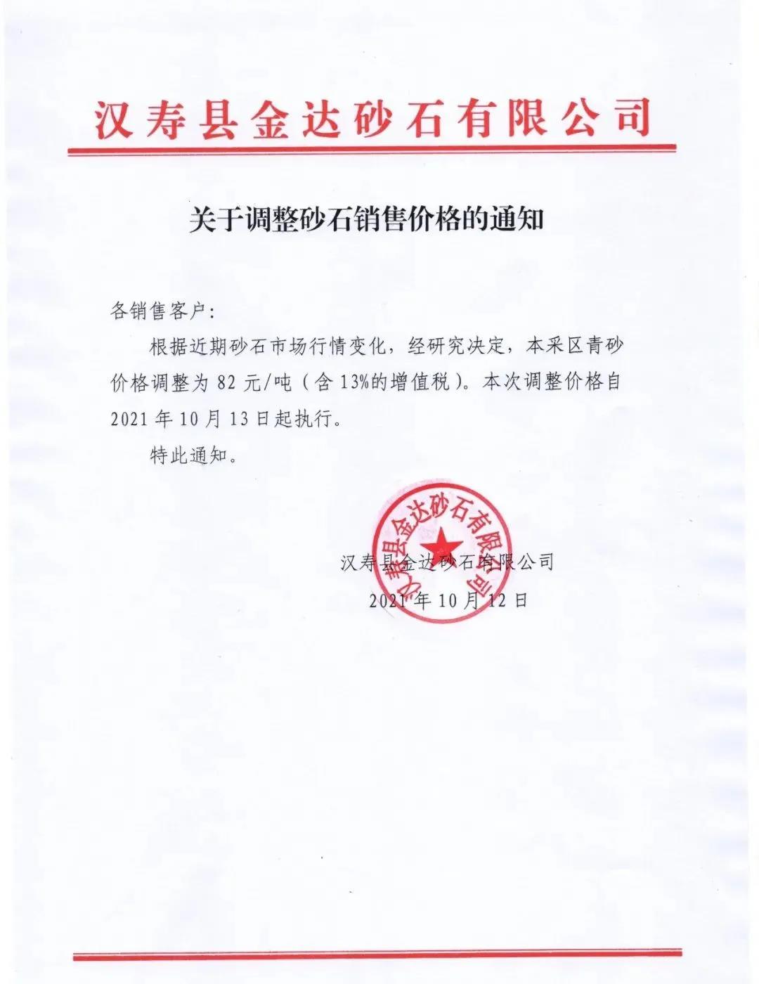 近日,漢壽縣金達砂石有限公司發布調價通知,青砂價格調整為82元/噸,較之前上漲3元/噸,自2021年10月13日開始執行。
