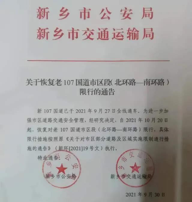自2021年10月20日起,新鄉將對老107國道平原示范區段實施貨車限制通行措施:
