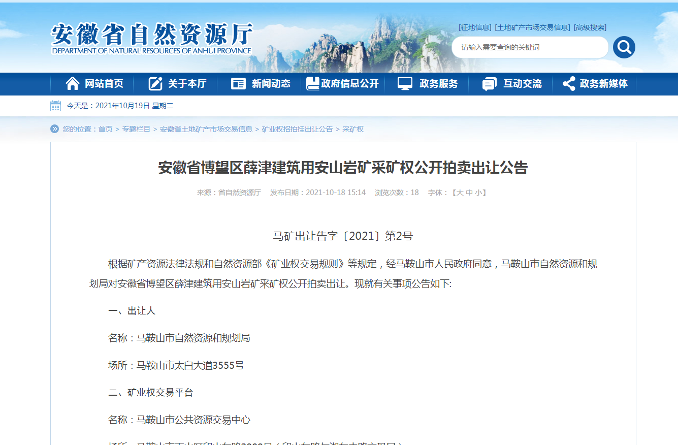 根據礦產資源法律法規和自然資源部《礦業權交易規則》等規定,經馬鞍山市人民政府同意,馬鞍山市自然資源和規劃局對安徽省博望區薛津建筑用安山巖礦采礦權公開拍賣出讓。現就有關事項公告如下:
