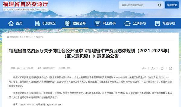 近日,福建省自然資源廳組織編制了《福建省礦產資源總體規劃(2021-2025年)(征求意見稿)》,全文分為總則、規劃背景、指導思想和原則、規劃目標、總體布局、礦產資源調查評價與勘查、礦產資源保護與開發利用、礦業綠色發展以及規劃實施與管理等幾大塊內容,目前正在面向社會公開征求意見。