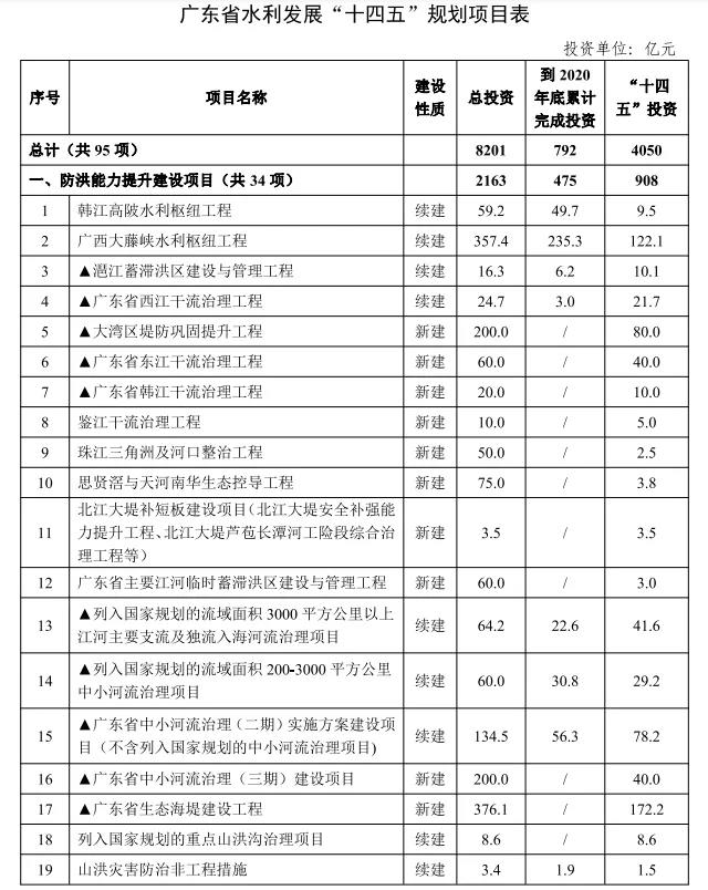 項目共95項,總投資規模8201億元,其中“十四五”投資規模4050億元,涵蓋防洪能力提升、水資源配置、農村水利保障、河湖健康保障、智慧水利工程等主要項目,著力推進水網建設,保障水安全。