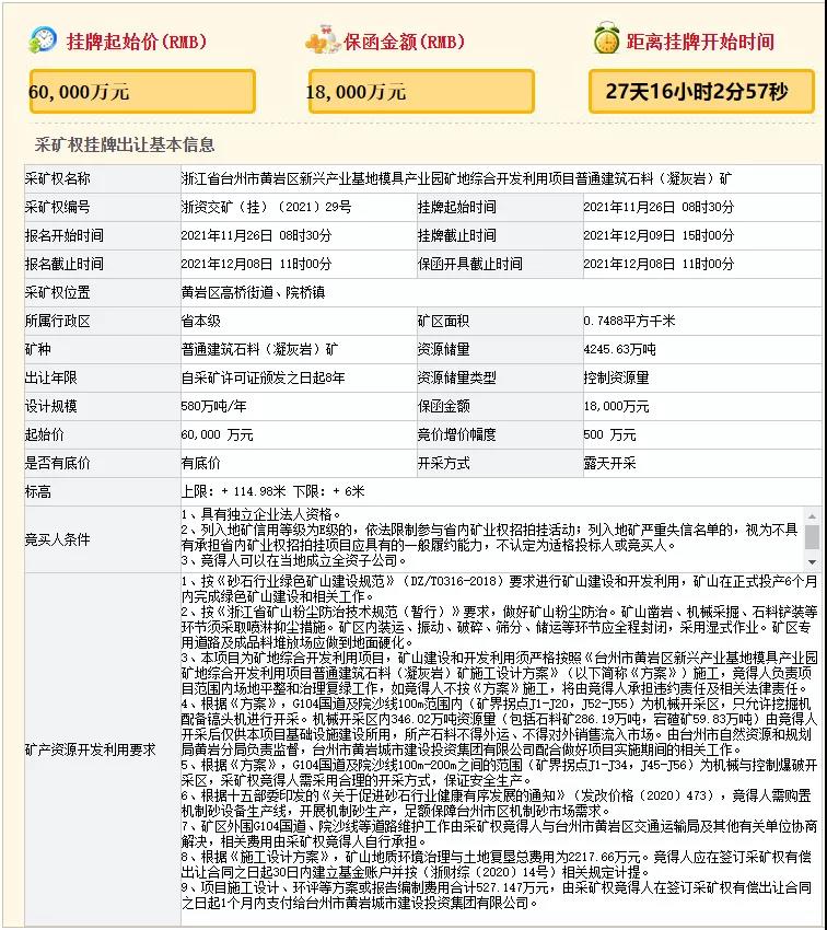 據了解,該礦區位于黃巖區高橋街道、院橋鎮,開采礦種為普通建筑石料(凝灰巖)礦,礦區面積約0.7488平方千米,采礦權出讓期限為自采礦許可證頒發之日起8年,生產規模580萬噸/年,掛牌出讓起始價為60000萬元,增價幅度為500萬元或500萬元整數倍。