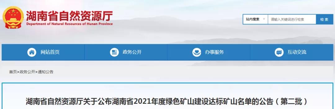 為推動礦業轉型發展,加快綠色礦山建設,按照《湖南省綠色礦山管理辦法》(湘自然資規〔2019〕4號)、《湖南省綠色礦山建設三年行動方案(2020-2022年)》(湘自然資發〔2020〕19號)要求,在企業自評、第三方評估、縣級驗收、市級推薦基礎上,經社會公示無異議,本批次,現納入湖南省綠色礦山名錄庫,接受社會監督。