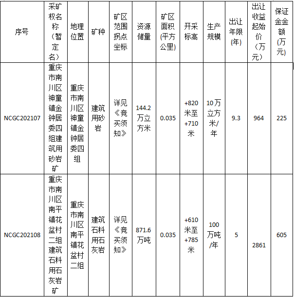 礦山基本情況,在NCGC202107采礦權出讓收益起始價964萬元中,含采礦權出讓前期工作成本9.66萬元,在NCGC202108采礦權出讓收益起始價2861萬元中,含采礦權出讓前期工作成本9.65萬元;在競買人競得后,不需支付以上采礦權出讓前期工作成本費用。NCGC202107和NCGC202108采礦權的《采礦權出讓技術報告》、《采礦權評估報告》已移交至南川區公共資源綜合交易中心暫存,如有需要請自行查閱。在報名截止前一天,重慶市南川區規劃和自然資源局會組織以上采礦權競買人現場踏勘,詳細了解礦區范圍及周邊民房、土地、山林權、交通運輸、社群關系主要范圍等影響因素,競買人若有需要,可報名參與現場踏勘。