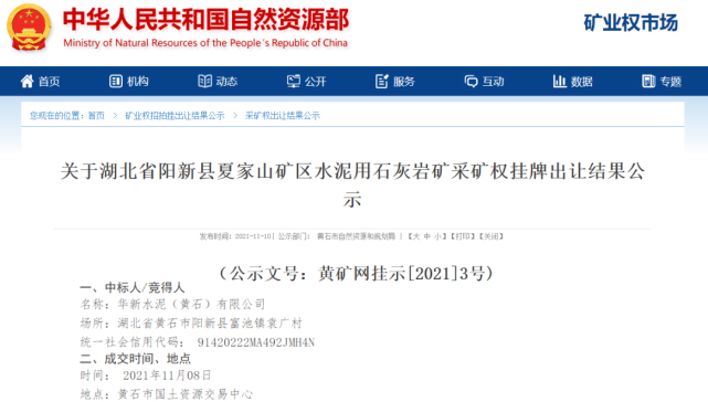 日前,湖北黃石市自然資源和規劃局發布公告,華新水泥(黃石)有限公司以8.2億元的最終價格成功競得湖北省陽新縣夏家山礦區水泥用石灰巖礦采礦權。