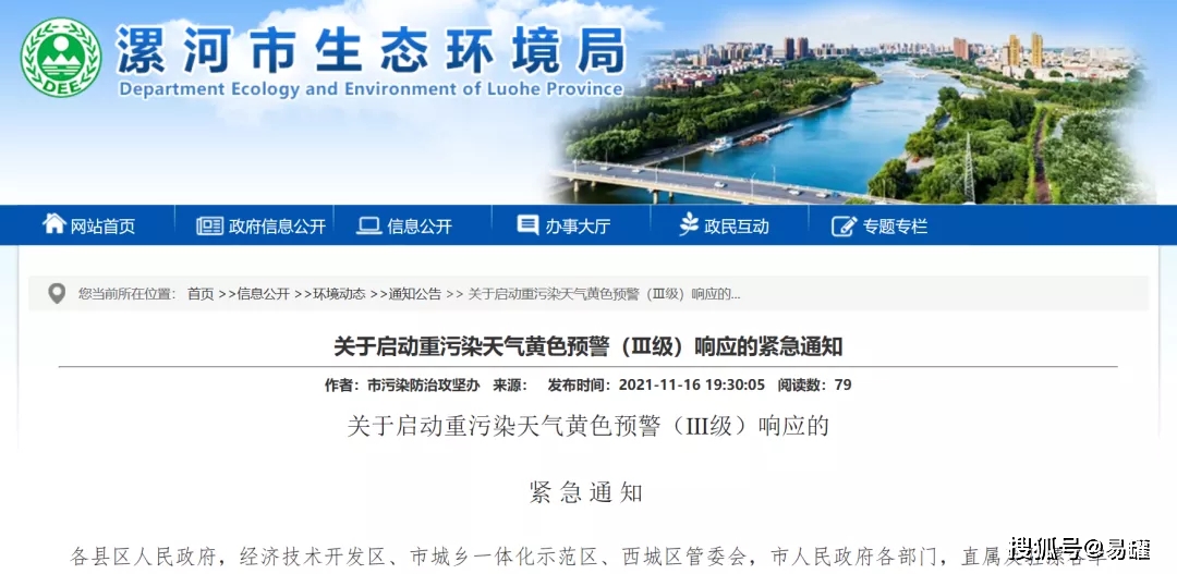漯河市自11月16日20時(shí)起,在全市范圍內(nèi)啟動(dòng)重污染天氣黃色預(yù)警(Ⅲ級(jí))應(yīng)急響應(yīng)。要求嚴(yán)格機(jī)動(dòng)車管控: