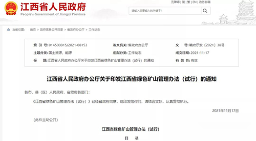 日前,為全面推進生態文明建設,加快業轉型綠色發展,江西省人民政府印發了《江西省綠色礦山管理辦法(試行)》。