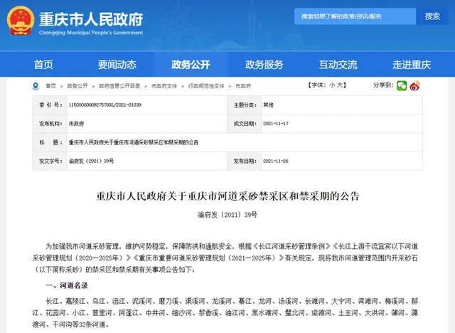 據了解,近日,重慶市政府網發布了《重慶市人民政府關于重慶市河道采砂禁采區和禁采期的公告》(以下簡稱公告),公告要求,長江、嘉陵江等32條河道,每年3月1日至6月30日將禁止采砂。