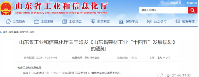 近日,山東省工業和信息化廳發布《山東省建材工業“十四五”發展規劃》(以下簡稱《規劃》),以貫徹落實《山東省國民經濟和社會發展第十四個五年規劃和2035年遠景目標綱要》和《山東省“十四五”制造強省建設規劃》,實現建材工業“宜業尚品、造福人類”的發展愿景,科學、高效地引導山東省建材工業高質量發展。