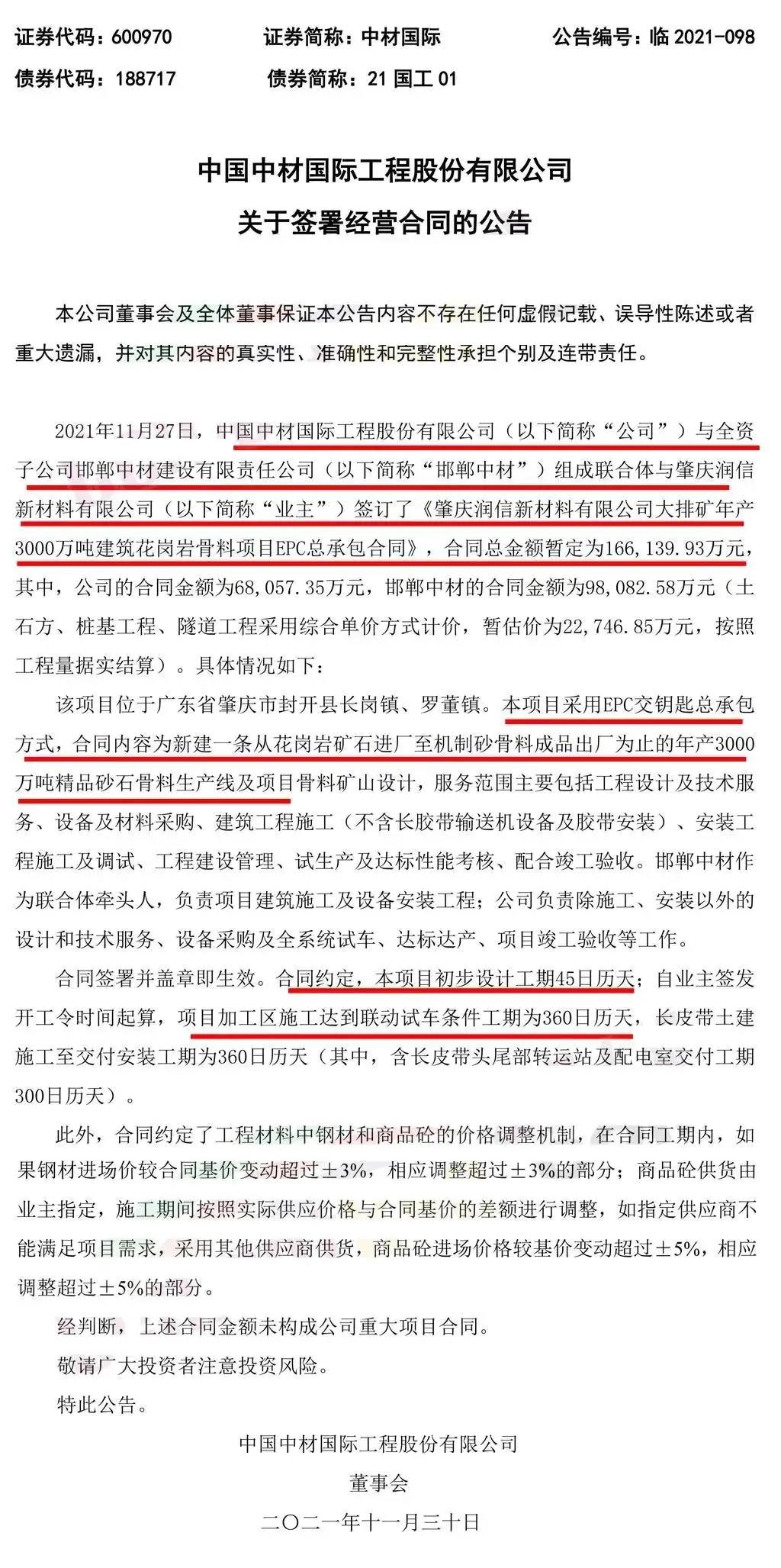 中材國際(600970.SH)公告,2021年11月27日,公司與全資子公司邯鄲中材建設(shè)有限責(zé)任公司(“邯鄲中材”)組成聯(lián)合體與肇慶潤信新材料有限公司(“業(yè)主”)簽訂了《肇慶潤信新材料有限公司大排礦年產(chǎn)3000萬噸建筑花崗巖骨料項(xiàng)目EPC總承包合同》,合同總金額暫定為16.61億元,其中,公司的合同金額為6.81億元,邯鄲中材的合同金額為9.81億元(土石方、樁基工程、隧道工程采用綜合單價(jià)方式計(jì)價(jià),暫估價(jià)為2.27億元,按照工程量據(jù)實(shí)結(jié)算)。