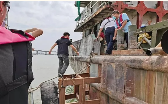 2021年9月,中央第四生態環境保護督察組在洪奇瀝水道現場檢查洗泥船只
