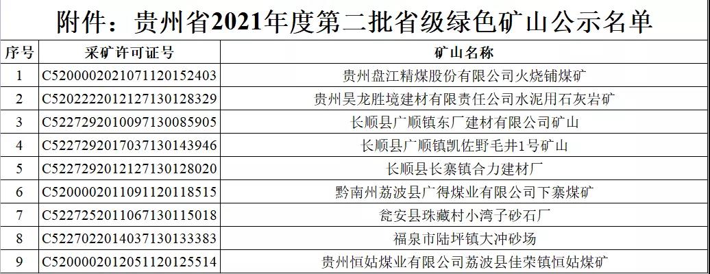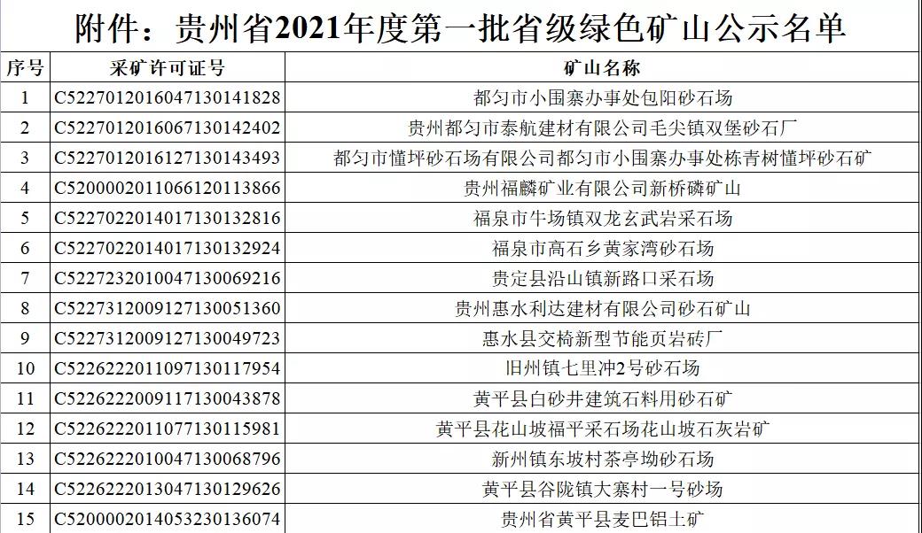 貴州省2021年度第一批省級綠色礦山遴選結果公示