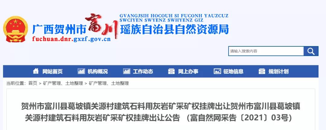 獲悉,廣西省賀州市公共資源交易中心掛牌交易方式公開出讓建筑石料用灰巖采礦權。資源量為3868.45萬噸,設計生產規模122萬噸/年,起始價:5450萬元。