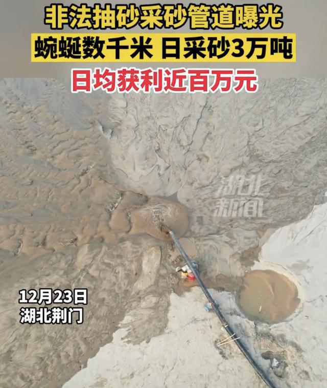 12月23日,湖北新聞官方報(bào)道了一起漢江非法采砂案,只見(jiàn)畫面中一根數(shù)千米的抽沙管蜿蜒在河岸上,每天可抽走3萬(wàn)多噸河砂,每日牟利能達(dá)到近百萬(wàn)元。