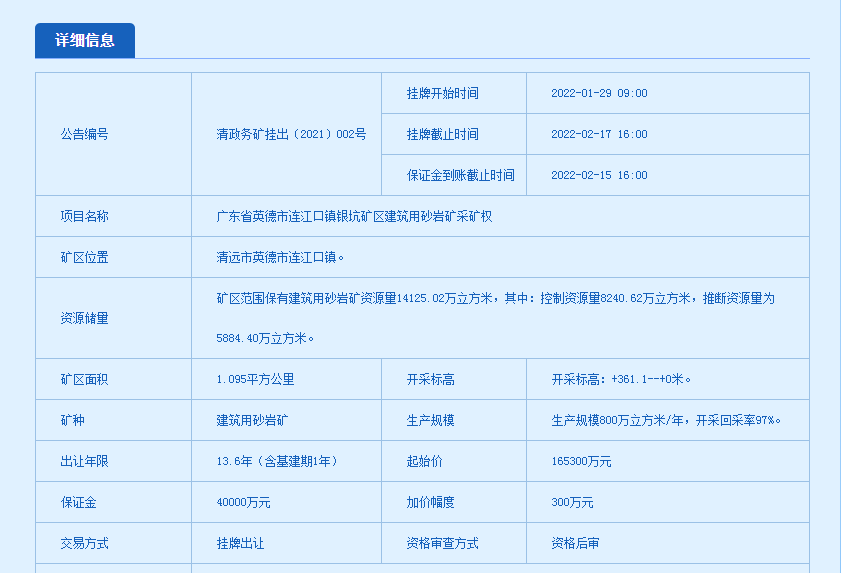 該礦區位于位于廣東省云浮市云安區SE100°方向,面積2.3544平方千米,開采標高571米至150米,可開采建筑用花崗巖,資源儲量22768.05萬立方米,生產規模1350萬立方米/年,擬出讓年限20年,起始價32億元。根據出讓公告,該采礦權競買申請人需一次性足額繳納競買保證金人民幣10億元。