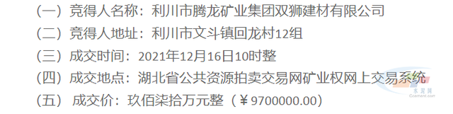 據了解,利川市騰龍礦業集團雙獅建材有限公司為該采礦權的原采礦權人,此次參與競買且競得了采礦權。