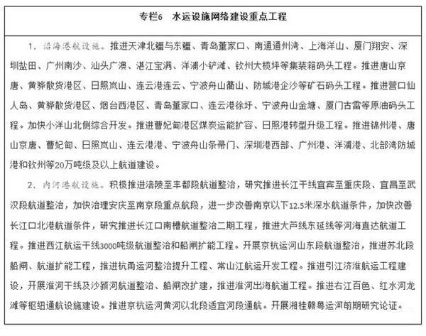 加強戰略骨干通道建設。推進出疆入藏通道建設。暢通沿江通道,加快建設沿江高鐵,優化以高等級航道和干線鐵路、高速公路為骨干的沿江綜合運輸大通道功能。升級沿海通道,提高鐵路通道能力,推進高速公路繁忙路段擴容改造,提升港口航道整體效能,構建大容量、高品質的運輸走廊。貫通沿邊通道,提級改造普通國省干線,推進重點方向沿邊鐵路建設,提高安全保障水平。建設西部陸海新通道,發揮鐵路在陸路運輸中的骨干作用和港口在海上運輸中的門戶作用,強化東、中、西三條通路,形成大能力主通道,銜接國際運輸通道。