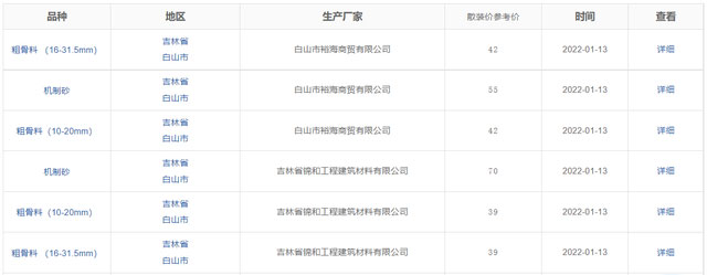粗骨料 (16-31.5mm)參考價格為39.00元/噸,近期價格保持平穩,供應商為吉林省錦和工程建筑材料有限公司機制砂參考價格為70.00元/噸,近期價格保持平穩,供應商為吉林省錦和工程建筑材料有限公司粗骨料(10-20mm)參考價格為39.00元/噸,近期價格保持平穩,供應商為吉林省錦和工程建筑材料有限公司