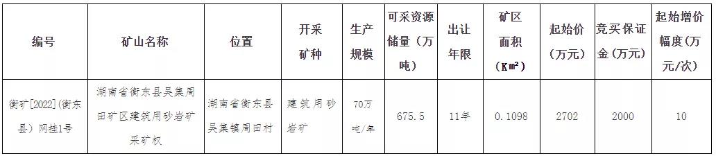 近日,衡陽市公共資源交易中心發布公告,掛牌出讓一建筑用砂巖礦采礦權。該采礦權全稱為湖南省衡東縣吳集周田礦區建筑用砂巖礦,礦區位于湖南省衡東縣吳集鎮周田村,礦區面積0.1098平方千米,可采資源儲量675.5萬噸,擬出讓11年,生產規模70萬噸/年,掛牌起始價2702萬元。
