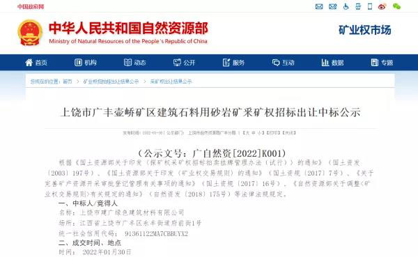 近日,上饒市建廣綠色建筑材料有限公司以3.16億元成功競得江西省上饒市廣豐壺嶠礦區建筑石料用砂巖礦采礦權。