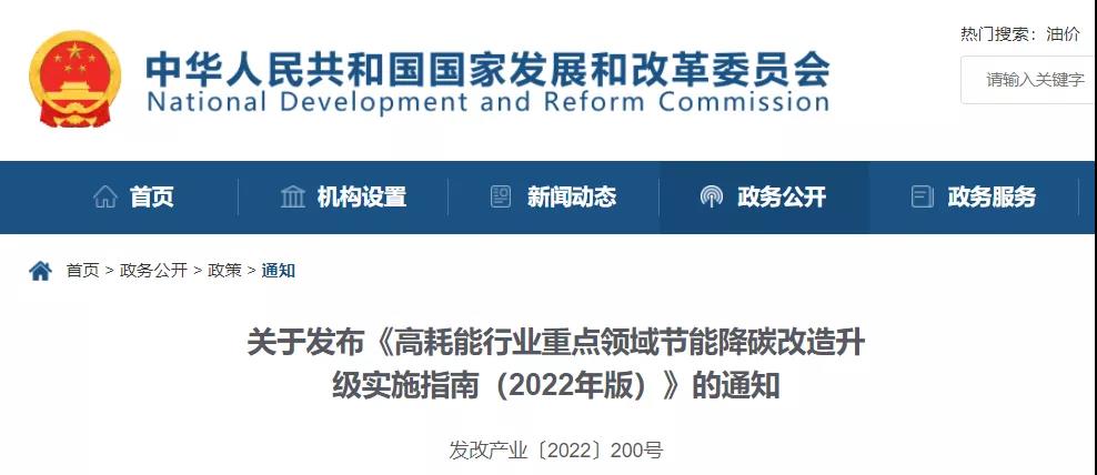 關于發布《高耗能行業重點領域節能降碳改造升級實施指南(2022年版)》的通知發改產業〔2022〕200號