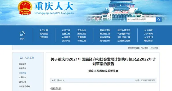 近日,重慶市第五屆人民代表大會第五次會議審查并批準了《關于重慶市2021年國民經濟和社會發展計劃執行情況及2022年計劃草案的報告》。該報告對2022年國民經濟和社會發展計劃進行了總體考慮,指出計劃實施市級重大建設項目850個,總投資約2.5萬億元,年度計劃投資約3570億元(暫列)。