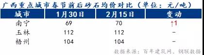 據百年建筑網調研,春節過后,廣西工程項目復工率達50.7%,整體項目施工進度較慢,需求不及預期,但基礎設施項目建設熱度不減,高速、港口等過年不停工項目建設持續給予砂石需求仍有存量;預計正月過后,南寧、玉林等地的砂石礦山企業或將全面復工,百色由于公共衛生事件影響,復工進度延遲。春節前后砂石價格及市場運行情況如下: