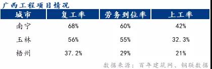 據百年建筑網調研全國10299個工程項目,廣西市場工程項目復工率為50.7%,較去年同期增長7.3%。分具體城市來看,南寧工程復工率為68%,預計下周工程復工率達78%;本輪工程勞務到位率為60%,預計下周工程勞務到位率達75%;本輪勞務上工率為42%,預計下周勞務上工率達50%。玉林工程復工率為56%,預計下周工程復工率達65%;本輪工程勞務到位率為55%,預計下周工程勞務到位率達65%;本輪勞務上工率為32.3%,預計下周勞務上工率達50%。梧州工程復工率為37.2%,預計下周工程復工率達50%;本輪工程勞務到位率為29%,預計下周工程勞務到位率達40%;本輪勞務上工率為21%,預計下周勞務上工率達30%。