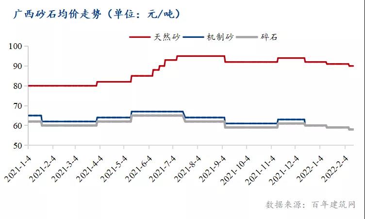 據百年建筑網統計,截至2月15日,節前廣西砂石市場均價為69.67元/噸,節后廣西砂石市場均價為68.67元/噸,周環比下降1.43%。目前南寧、玉林、梧州等地主要供應高速、港口等基建項目,市場需求較穩,砂石料價格暫穩;百色由于疫情以及環保管控影響,企業及施工項目復工延后,市場供需雙弱,砂石價格穩中偏弱運行。