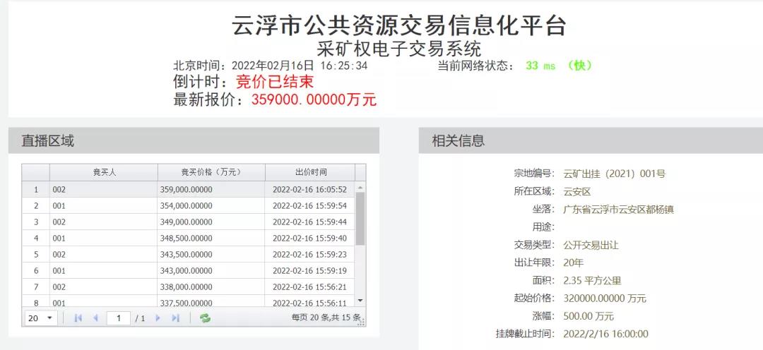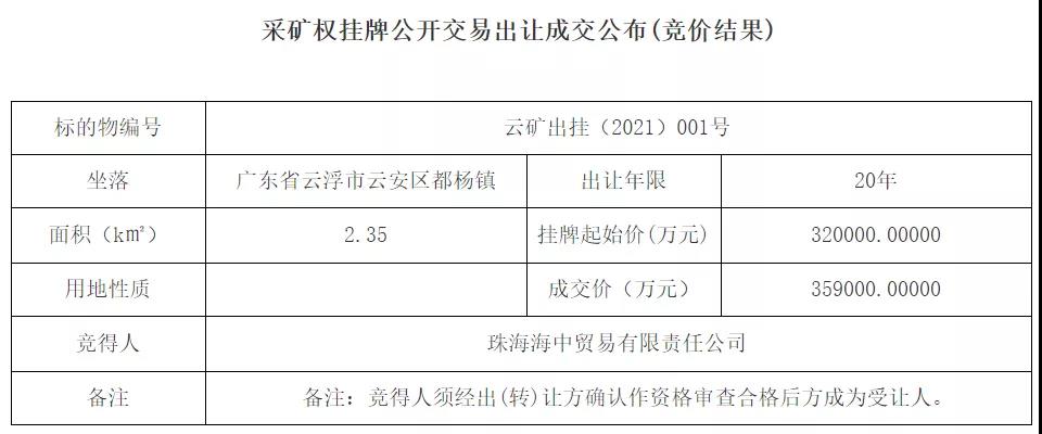 2月16日,云浮市云安區都楊鎮觀音山礦區建筑用花崗巖礦采礦權在云浮市公共資源交易網公開掛牌出讓,起拍價32億,歷經多輪報價后,最終被珠海海中貿易有限責任公司以35.9億收入囊中。