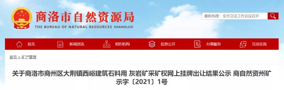 商洛市自然資源局商州分局關于商洛市商州區大荊鎮西峪建筑石料用灰巖礦采礦權網上掛牌出讓結果公示