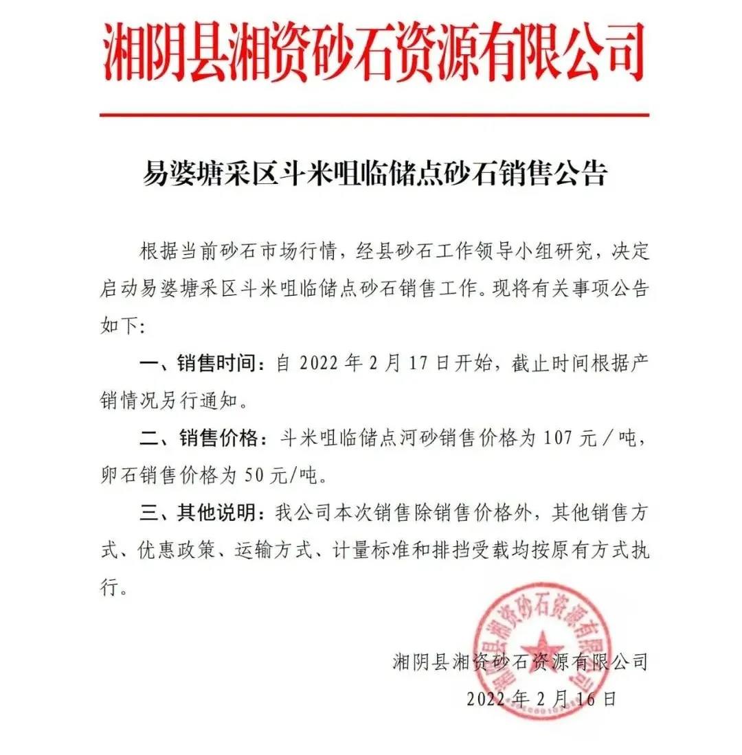 近日,湖南省湘陰縣湘資砂石資源有限公司發布易婆塘采區斗米咀臨儲點砂石銷售公告,易婆塘采區斗米咀臨儲點河砂和卵石,價格最新調整: