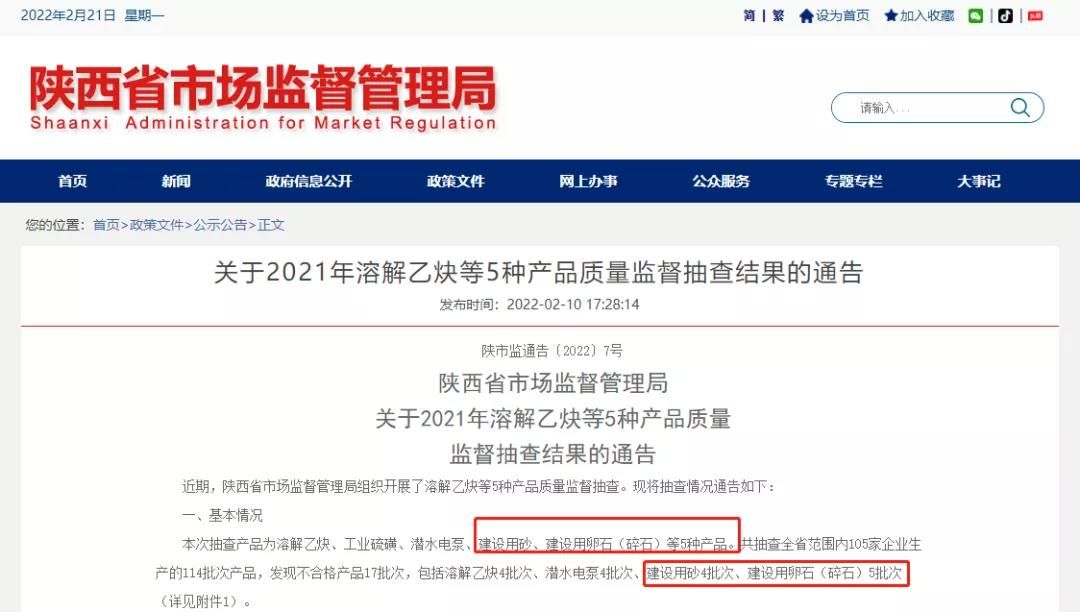 2月10日,陜西省市場監督管理局發布2021年建設用砂產品質量監督抽查結果。結果顯示,在生產領域抽查了西安、渭南、漢中、安康等地區14家企業生產的15批次產品,發現不合格產品4批次。重點對顆粒級配、含泥量/石粉含量、泥塊含量、表觀密度、松散堆積密度與孔隙率等5個項目進行了檢驗。不合格項目涉及顆粒級配。