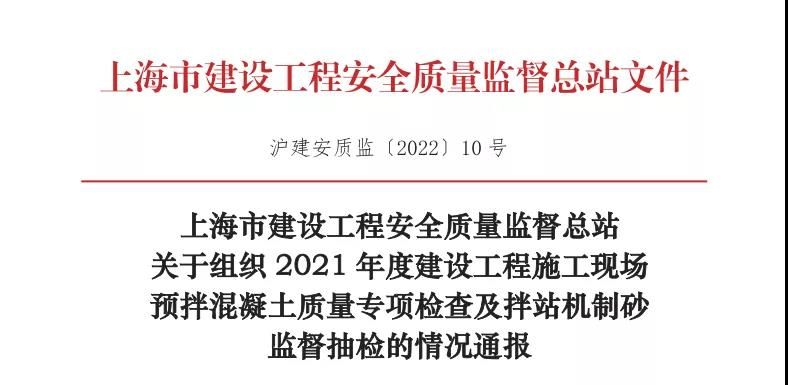近日,上海建設工程安全質量監督總站發布《2021年度建設工程施工現場預拌混凝土質量專項檢查及攪拌機制砂監督抽檢的情況通報》。