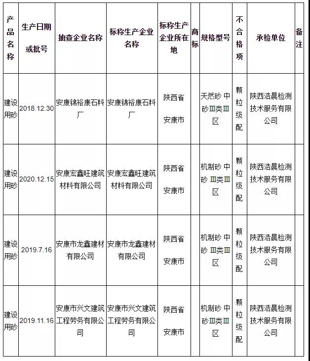 2022年2月10日,陜西省市場監督管理局網站通告2021年建設用砂產品質量監督抽查結果,在生產領域抽查了西安、渭南、漢中、安康等地區14家企業生產的15批次產品,發現不合格產品4批次。重點對顆粒級配、含泥量/石粉含量、泥塊含量、表觀密度、松散堆積密度與孔隙率等5個項目進行了檢驗。不合格項目涉及顆粒級配。