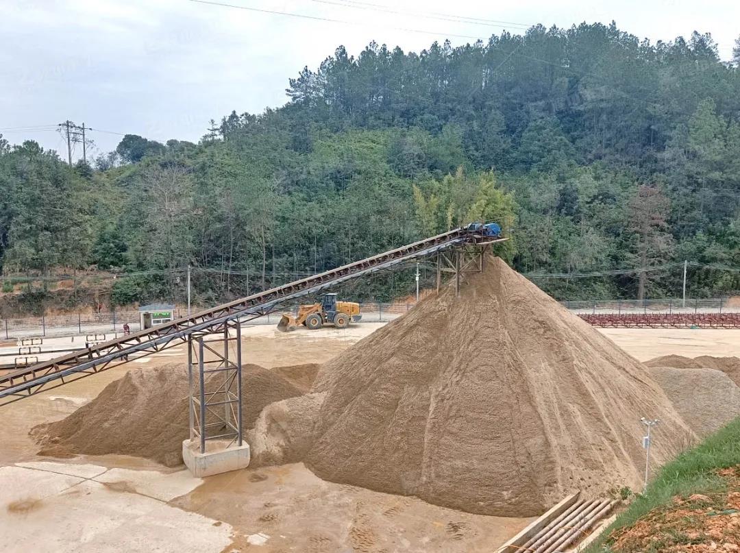 1、物料通過圓振篩篩分后通過溜槽進入到多功能一體機進行洗砂并脫水,脫水后的成品砂通過傳送帶運至成品堆場;