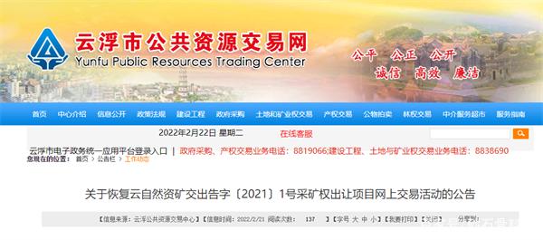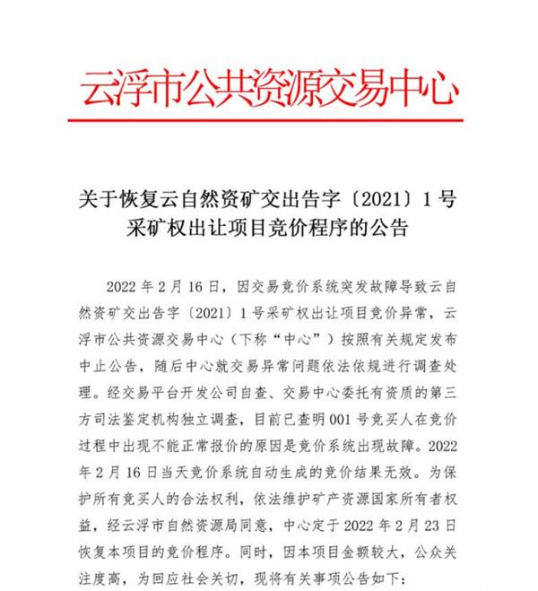 2月21日,云浮市公共交易中心發布《關于恢復云自然資礦交出告字〔2021)1號采礦權出讓項目競價程序的公告》。