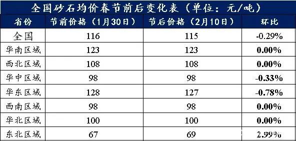 從上表可以看出,華南、西北、西南、華北區域砂石均價春節前后持穩運行;華中區域砂石均價為97.7元/噸,較節前環比下跌0.33%;華東區域砂石價格節前環比下跌0.78%;東北區域港口平倉較節前上漲2.99%。