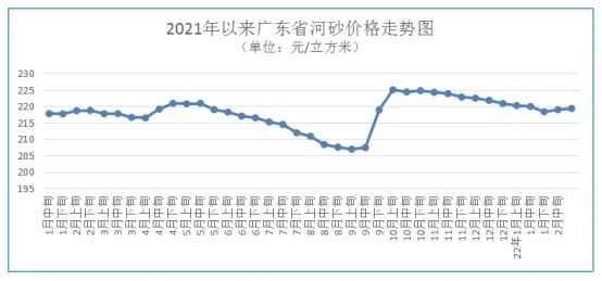 據監測,2月中旬廣東省河砂平均購進價為每立方米219元,比春節前(與1月下旬比,下同)微漲0.17%。其中,中砂(0.35-0.5mm)購進價為每立方米236元,比春節前微漲0.57%;粗砂(大于0.5mm)購進價為每立方米202元,比春節前微跌0.28%。