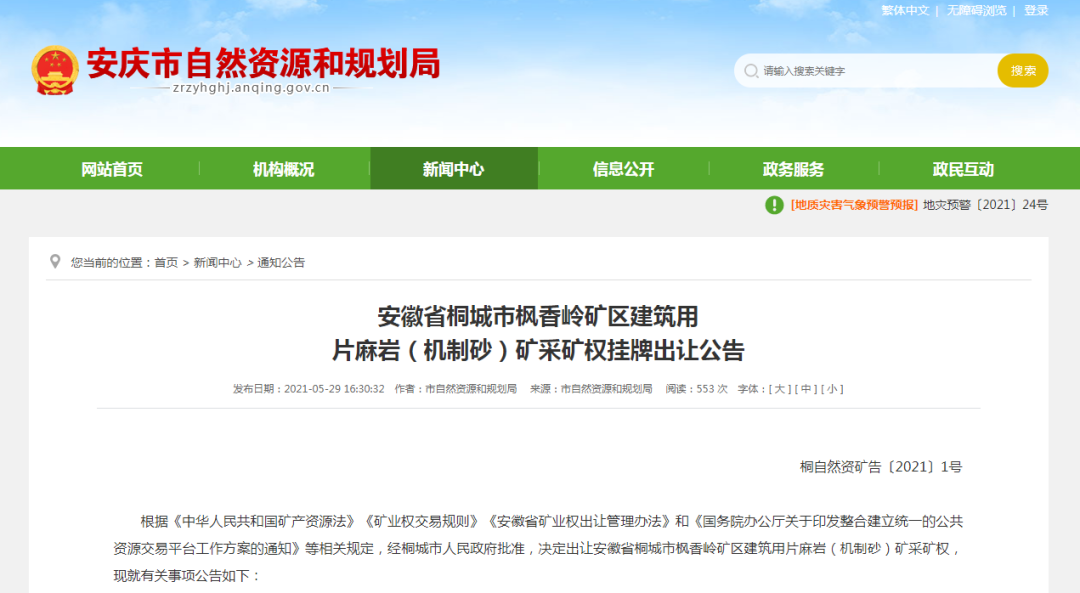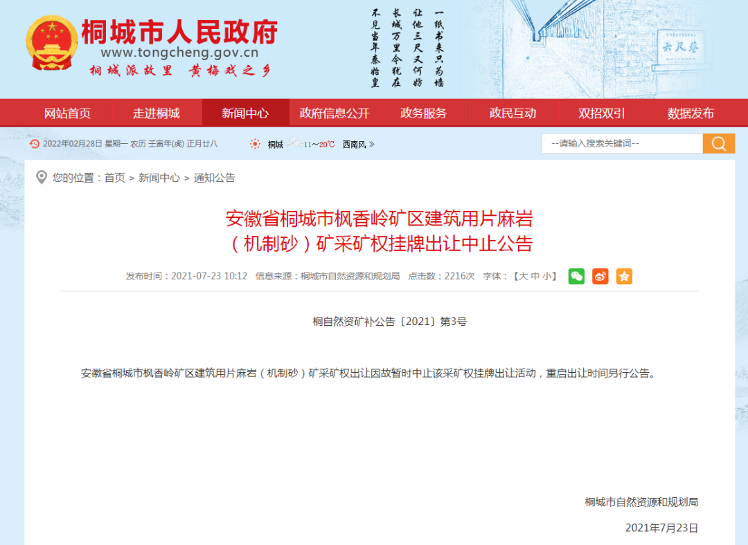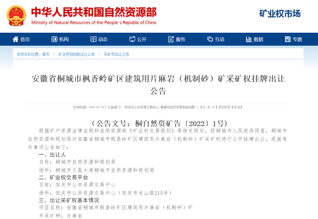 2月25日,安徽省自然資源廳發布公告,決定以掛牌方式出讓安徽省桐城市楓香嶺礦區建筑用片麻巖(機制砂)礦采礦權。值得注意的是,該礦權2021年5月29日第一次掛牌出讓,卻因故出讓活動于2021年7月23日暫時中止,時隔7個月,該礦權重啟掛牌出讓!