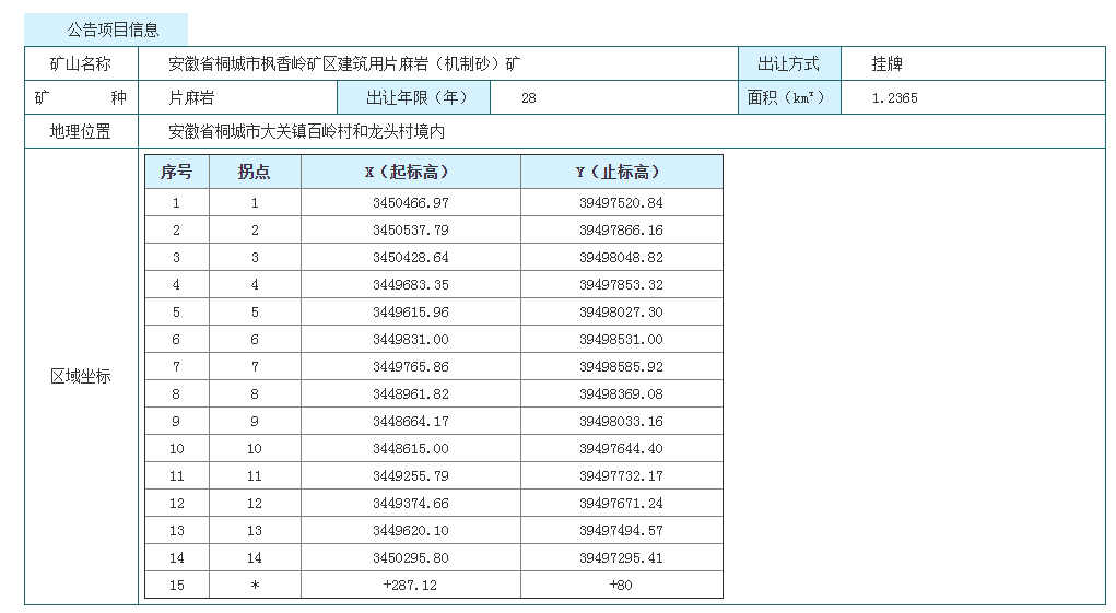 據悉,該礦區位于安徽省桐城市大關鎮百嶺村和龍頭村境內,礦區面積1.2365平方千米,開采標高+287.12~+80米;開采方式為露天開采,可采資源量25235.57萬噸,生產規模980萬噸/年,擬出讓年限28年(含基建期2年),掛牌起始價為人民幣129500萬元。