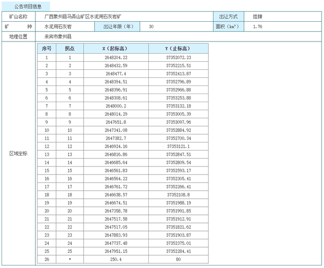 該項(xiàng)目名稱為廣西象州縣馬弄山礦區(qū)水泥用石灰?guī)r礦,礦區(qū)位于廣西來賓市象州縣,礦區(qū)面積1.76平方千米。