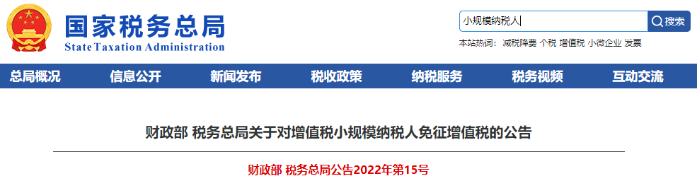 財政部 稅務(wù)總局關(guān)于對增值稅小規(guī)模納稅人免征增值稅的公告財政部 稅務(wù)總局公告2022年第15號
