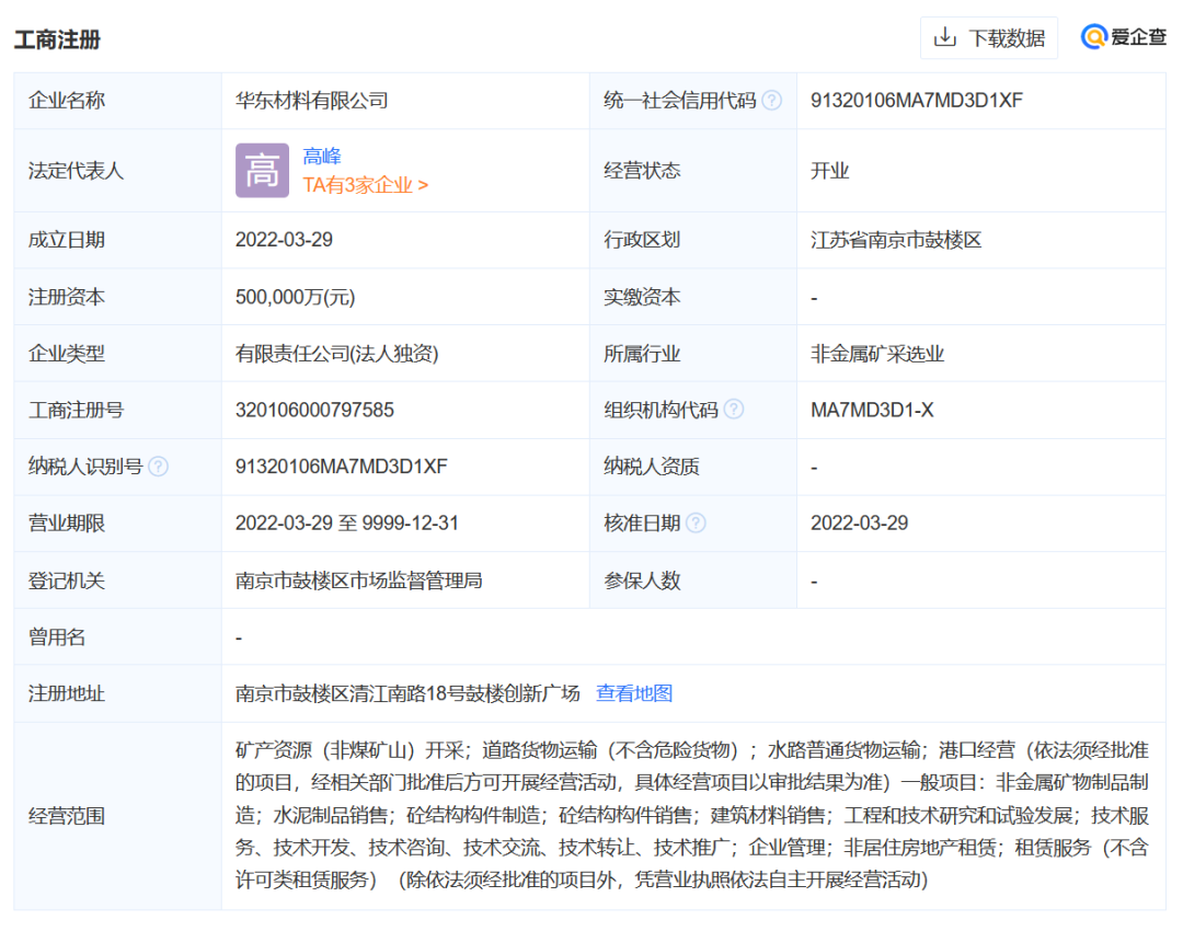 2022年3月29日,華東材料有限公司正式注冊成立。愛企查顯示,華東材料有限公司注冊資本為50億元。