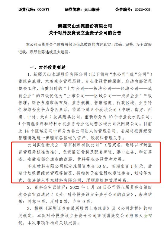 今年1月,天山股份曾發布公告稱,公司擬注冊成立“華東材料有限公司”,負責沿江骨料及配套廊道、港口業務,和江蘇省、安徽省部分城市的商混、骨料等業務經營和發展。華東材料有限公司擬定注冊資本金50億,首期出資1億元,后期計劃根據經營管理等情況,將相關子企業股權通過整合、劃轉等方式,依法納入華東材料有限公司,理順股權和管理關系。